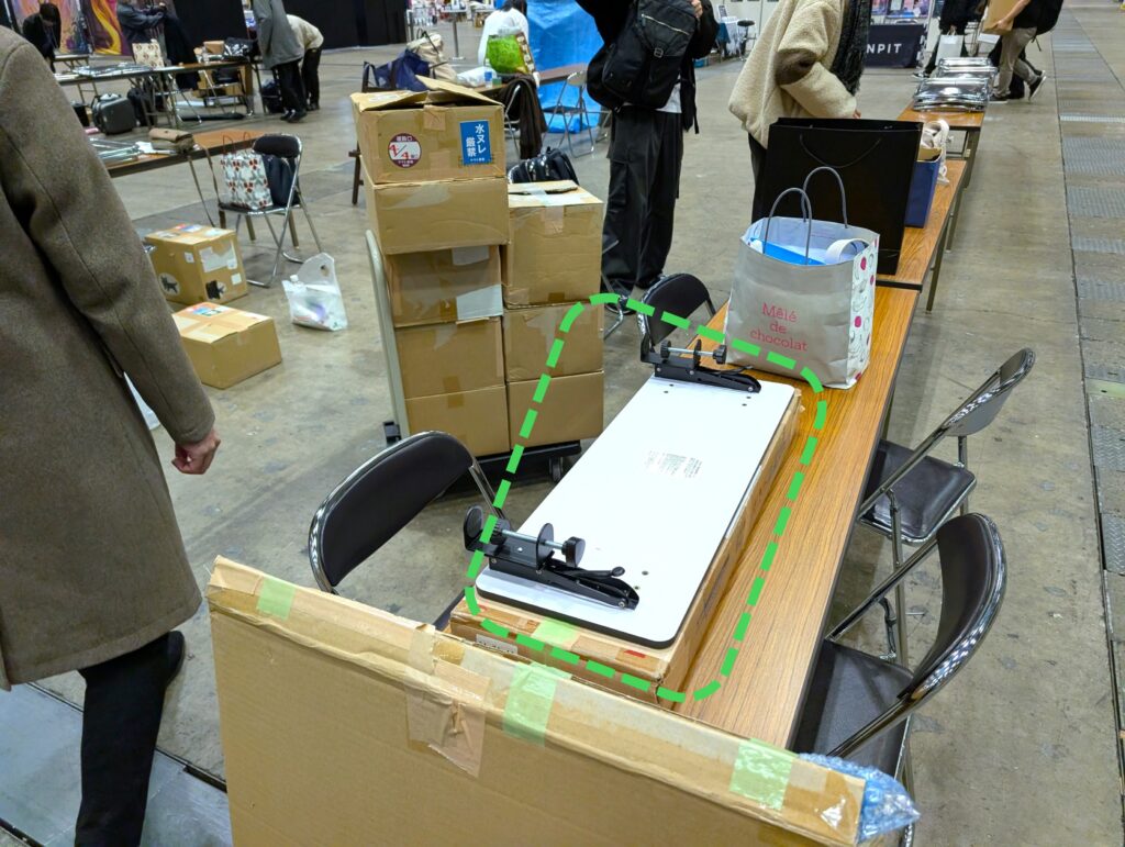 「試遊台があります!」という看板をどこに設置するか悩んでいましたが、向かいのスペースの方が椅子に張り付けているのを見てパク…参考にさせていただきました。