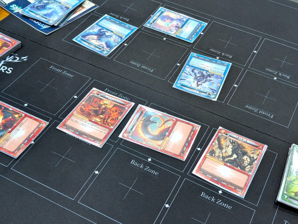プレイマットを2つ敷いて試遊する際に、ゲームマーケットの机だと奥行きが足らないためサイドテーブルを購入してこちら側に設置することで奥行きを確保しました。