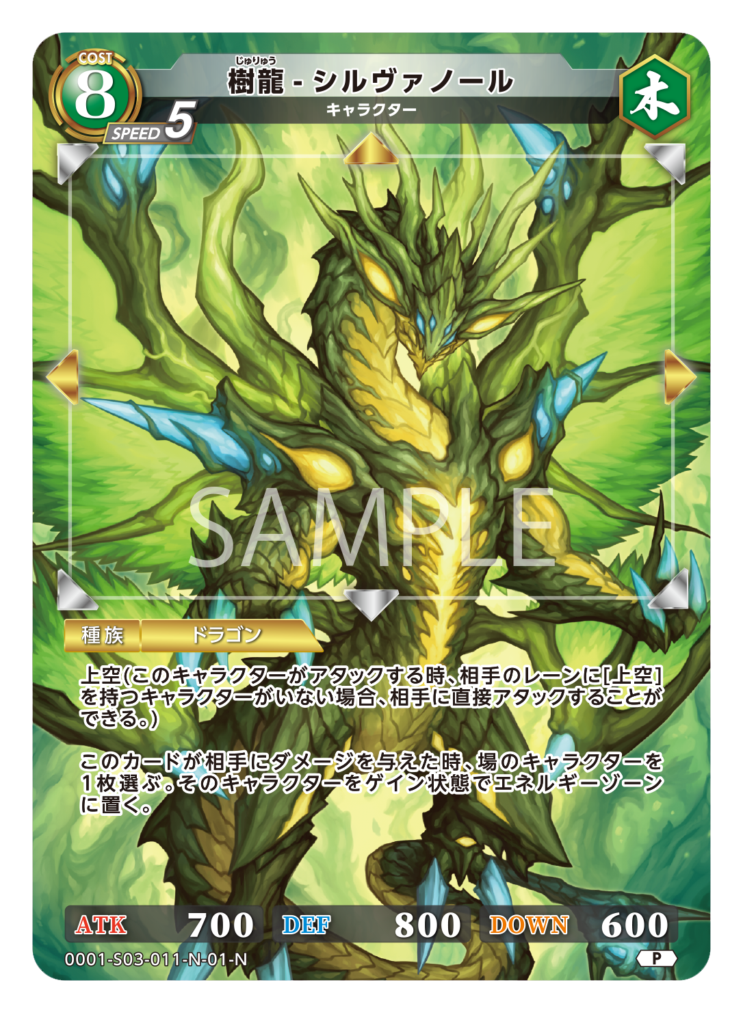 移動:↑→← ATK:700 DEF:800 DOWN:600 種族:ドラゴン 樹龍-シルヴァノール じゅりゅう シルヴァノール 種別:キャラクター サブ種別: コスト:8 属性:木 スピード:5 …