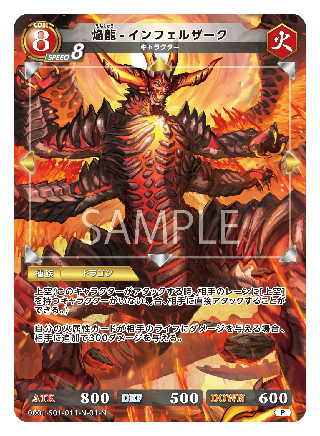 移動:↑→← ATK:800 DEF:500 DOWN:600 種族:ドラゴン 焔龍-インフェルザーク えんりゅう インフェルザーク 種別:キャラクター サブ種別: コスト:8 属性:火 スピード…