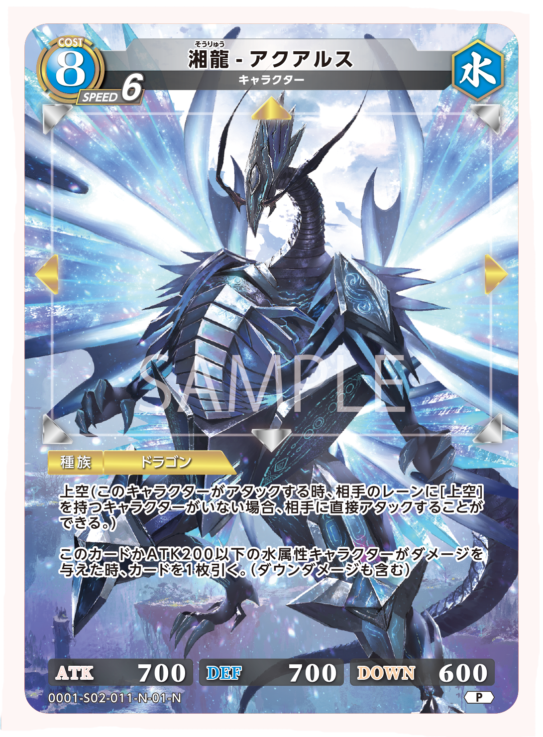 移動:↑→← ATK:700 DEF:700 DOWN:600 種族:ドラゴン 湘龍-アクアルス そうりゅう アクアルス 種別:キャラクター サブ種別: コスト:8 属性:水 スピード:6 レアリテ…