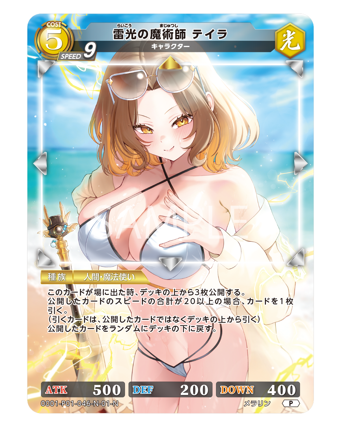 移動:↑ ATK:500 DEF:200 DOWN:400 種族:人間・魔法使い 雷光の魔術師 テイラ らいこうのまじゅつし テイラ 種別:キャラクター サブ種別: コスト:5 属性:光 スピー…