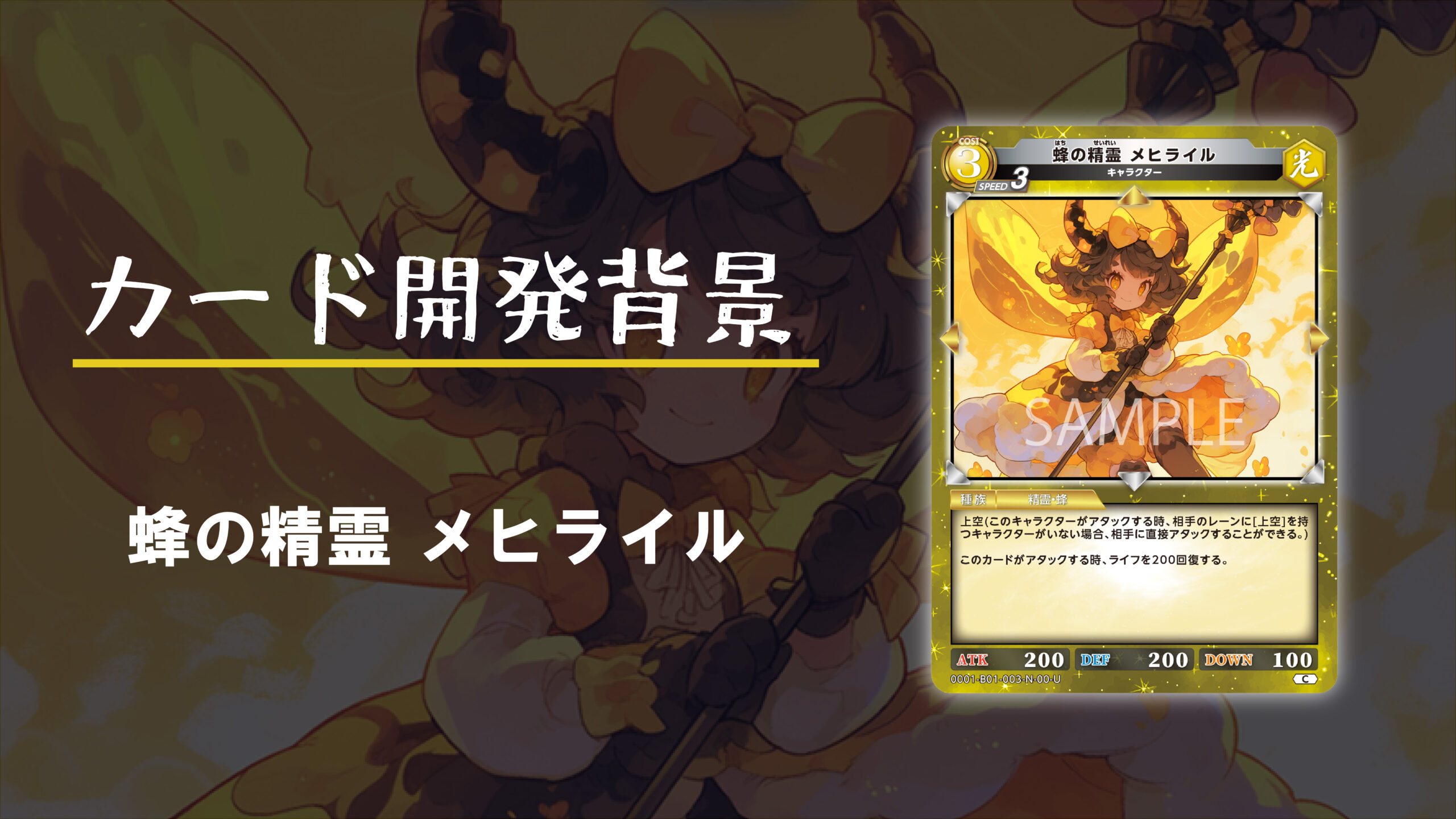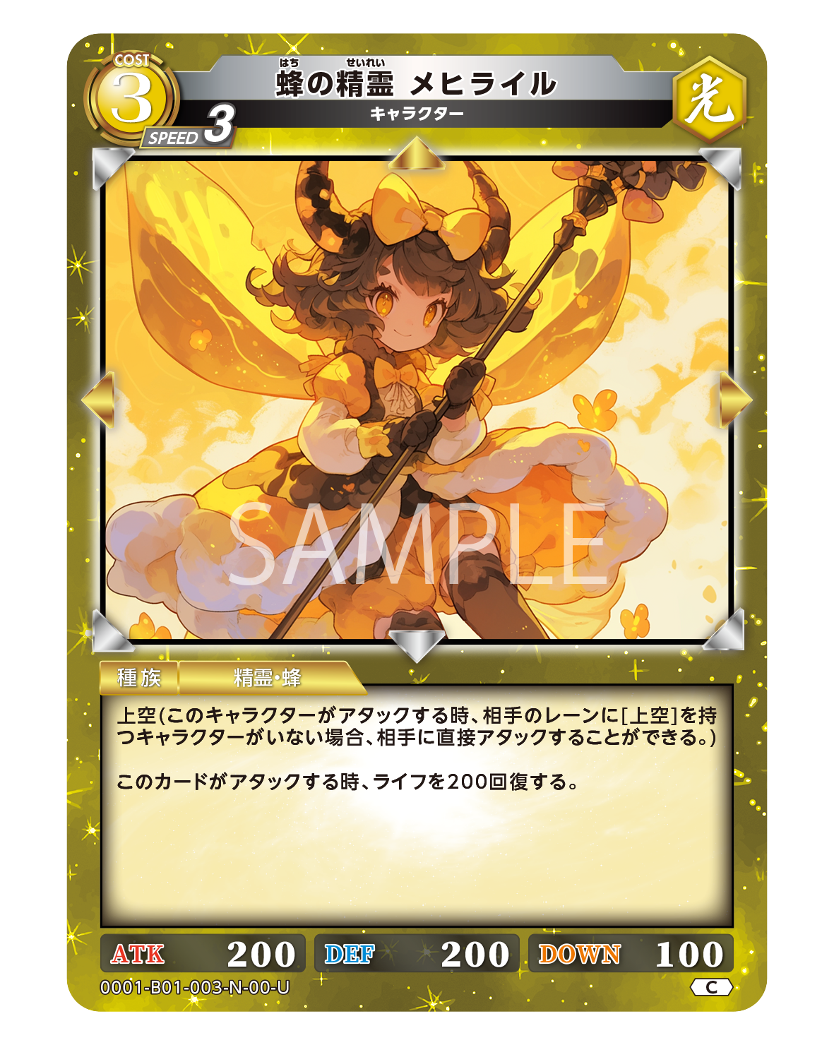 移動:↑→← ATK:200 DEF:200 DOWN:100 種族:精霊・蜂 蜂の精霊 メヒライル はちのせいれい メヒライル 種別:キャラクター サブ種別: コスト:3 属性:光 スピード:3 …