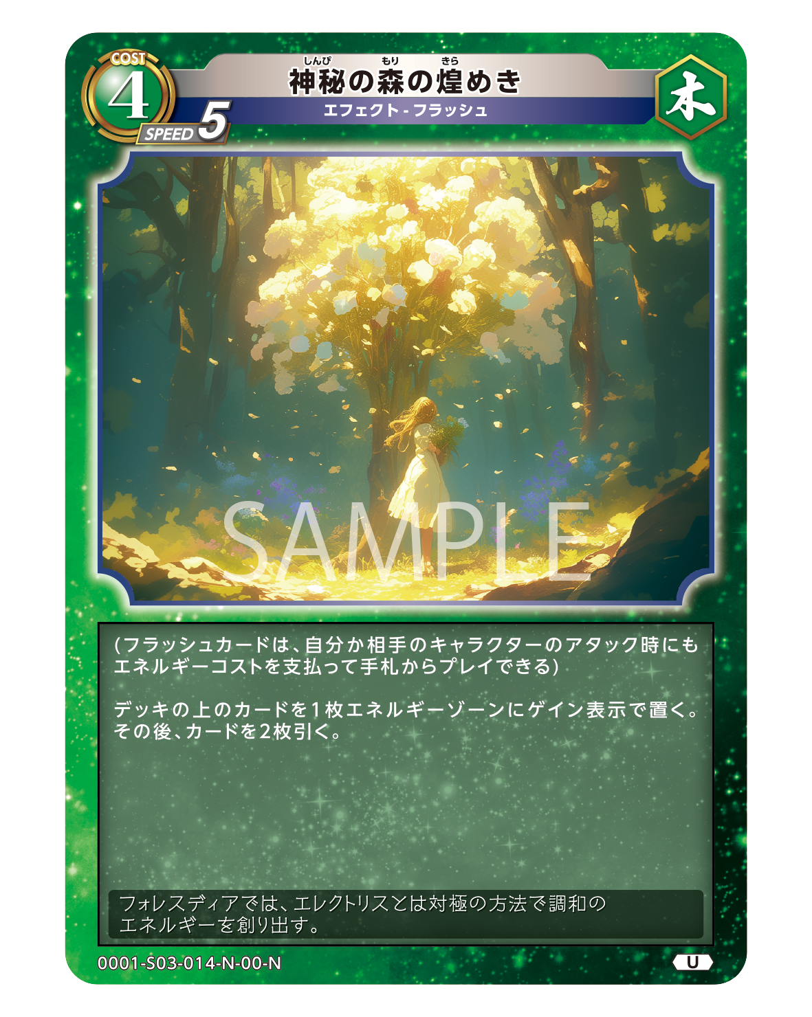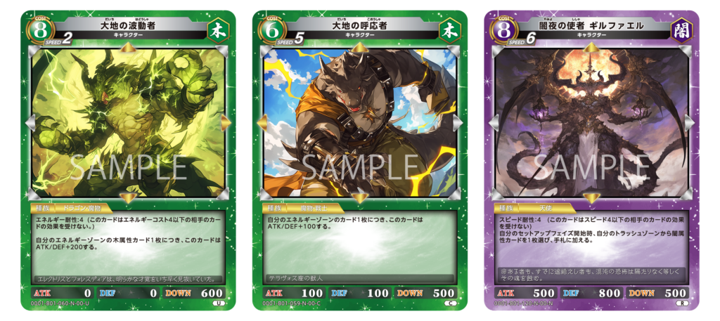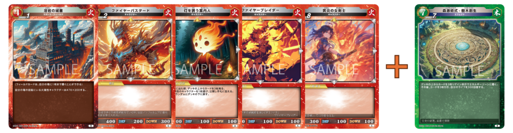 {森激術式-樹木創生}はスターターデッキ「DeepForest」に収録された7コストの大型エフェクトカードであり、同時期に発売した火・水・土にも7コストのエフェクトカードの属性サイクルとして収録されています。