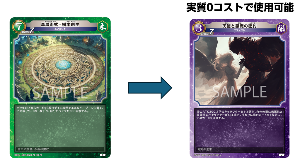 さらにこのカードの対策として「アグロデッキを使用して使用される前に倒す」といった戦法も考えられますが、ひとたび7コストまで達成し{森激術式-樹木創生}を撃たれてしまうと、ライフを300回復されながら3コスト分の対処を行われてしまいます。このライフ回復がアグロデッキにとっては想定以上に重く、先細りしやすいアグロデッキにとってキルターンを伸ばされててしまうことは苦しいゲーム展開を強いられます。