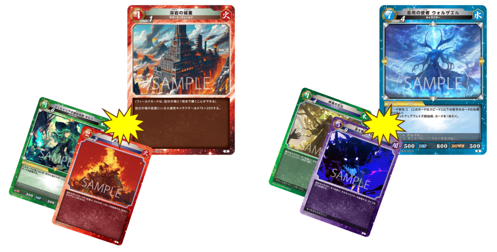 サポートカードの{溶岩の城塞}や、キャラクターカードの{雷雨の使者 ウォルザエル}といった場に残るカードは、場に残れば継続的に有利になる状況を作れる一方で、次のターンにサポートカードやキャラクターカードを破壊するカードを使うことで対処する猶予が生まれます。