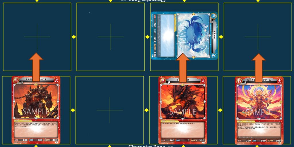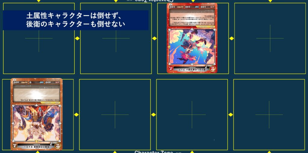 {炎激術式-灼來}はフィニッシャー級の力を手に入れますが、あらかじめ場にアタックできるキャラクターを用意しておく必要があります。また火属性キャラクターに限定しているため、デッキ構築にもある程度の制約が入ります。
